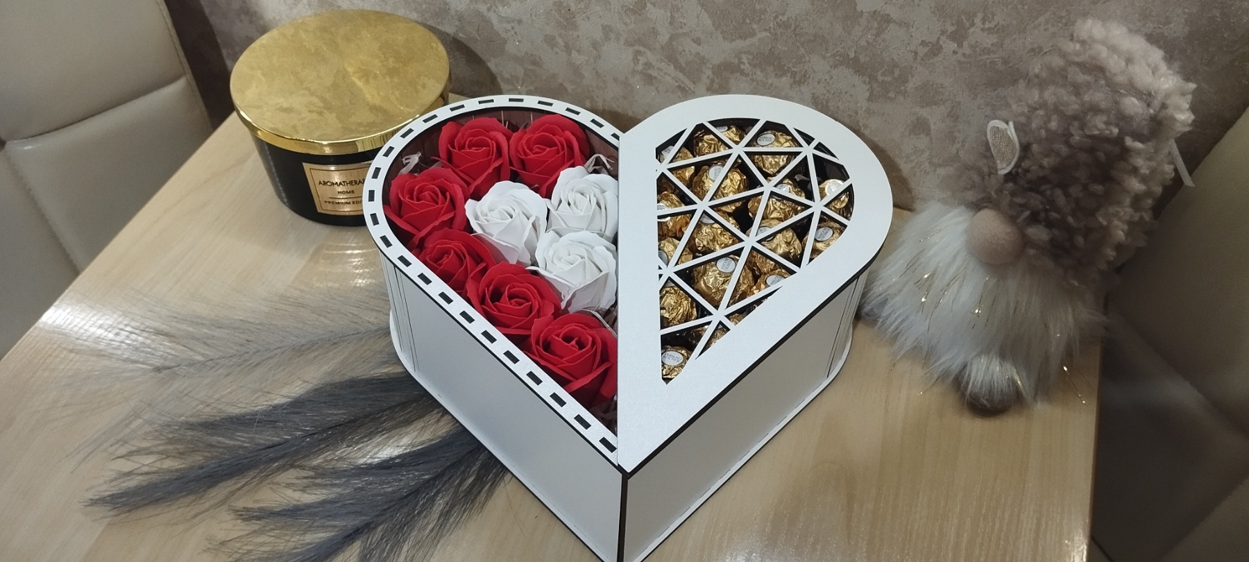 Цей бокс — ідеальний вибір для тих, хто цінує класику та витонченість. Двосекційна коробка у формі серця поєднує в собі ніжність декоративних троянд та розкішний смак преміальних цукерок у золотистій обгортці.